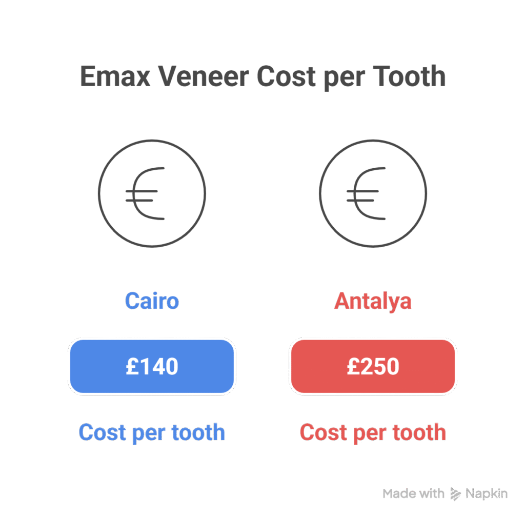 At Professors Dental Clinic in Cairo, Emax veneers cost just £140 per tooth—44% less than Antalya prices—totaling approximately £1,350 for 10 veneers using identical Ivoclar Vivadent Emax materials.